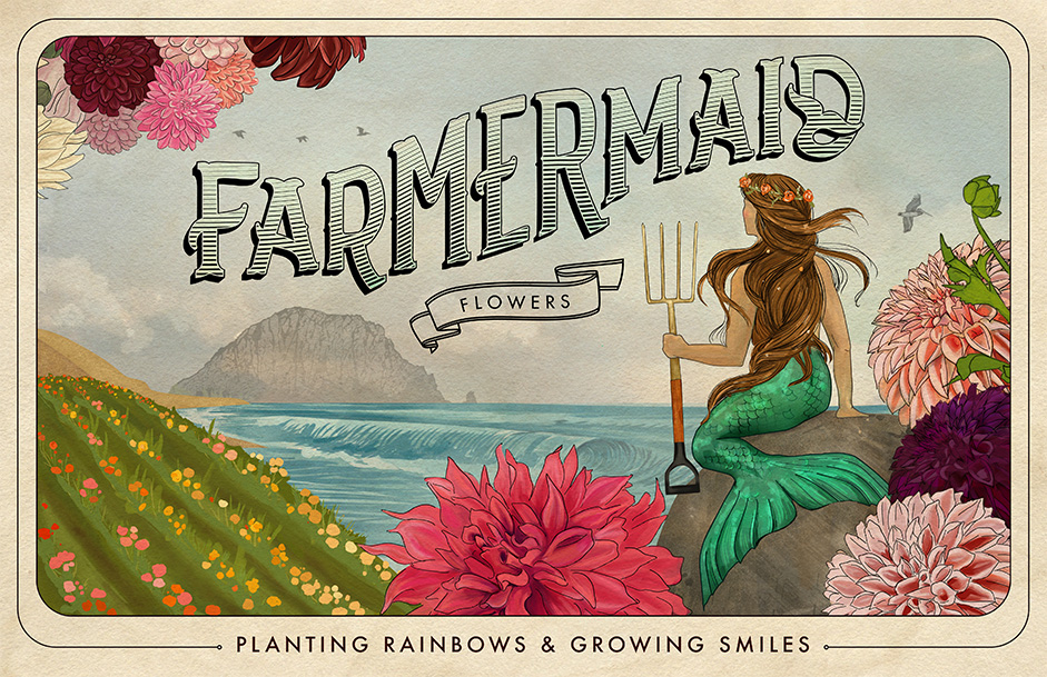 Courtney, the owner of Farmermaid Flowers, has been steadily growing her business and wanted a unique illustration to market her gorgeous flowers (that she grows herself, on her own farm). The goal was to create a timeless piece of art that relates back to the nostalgic labels that used to decorate farmer's crates. The end result is something she continues to use for marketing to grocers, farmer's markets, and connecting with her online community.