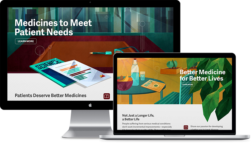 Custom illustrations were created to enrich the ChemoCentryx website and influence visuals for an executive keynote presentation design. The goal was to show ChemoCentryx as a future thinking company among their bio-pharmaceutical competitors.