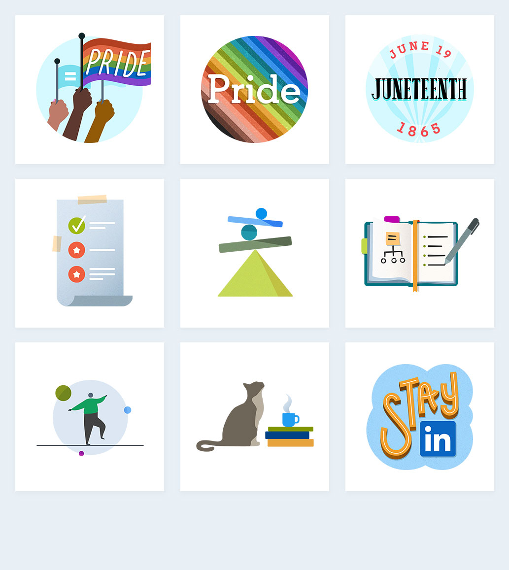 As a Staff Communication Designer at LinkedIn, I have the ability to wear many different hats, and one of my favorites is illustrator. In early 2020, I had the lucky opportunity to partner with the LinkedIn Stories team to create sticker illustrations unique to LinkedIn's app. These sticker illustrations are available to millions in the U.S., Brazil, the United Arab Emirates, the Netherlands, and India. It is a special feeling to know my work can be accessed by a global audience and can have a meaningful impact on the engagement and delight of our users.