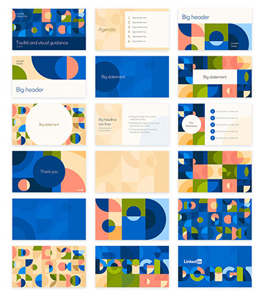 In October of 2020, LinkedIn wanted to create a sense of inclusion among the many types of designers that belong to the creative team. Previously labeled the "User Experience Design Team," this shift to "LinkedIn Design" brought about an opportunity to create a unique brand expression. The Executive Presentation Design team is known for our ability to push creativity while staying within brand guidelines, so we were approached to create a visual identity unique to our team, while keeping the framework of the overarching LinkedIn brand. After our team's initial explorations, It was an honor to have my direction chosen.